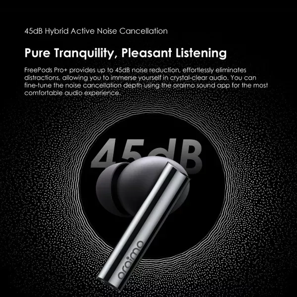 Los FreePods Pro+ ofrecen una reducción de ruido de hasta 45 dB, eliminan las distracciones sin esfuerzo y te permiten sumergirte en un audio nítido. Puedes ajustar la profundidad de cancelación de ruido con la aplicación Oraimo Sound para disfrutar de la experiencia de audio más cómoda.