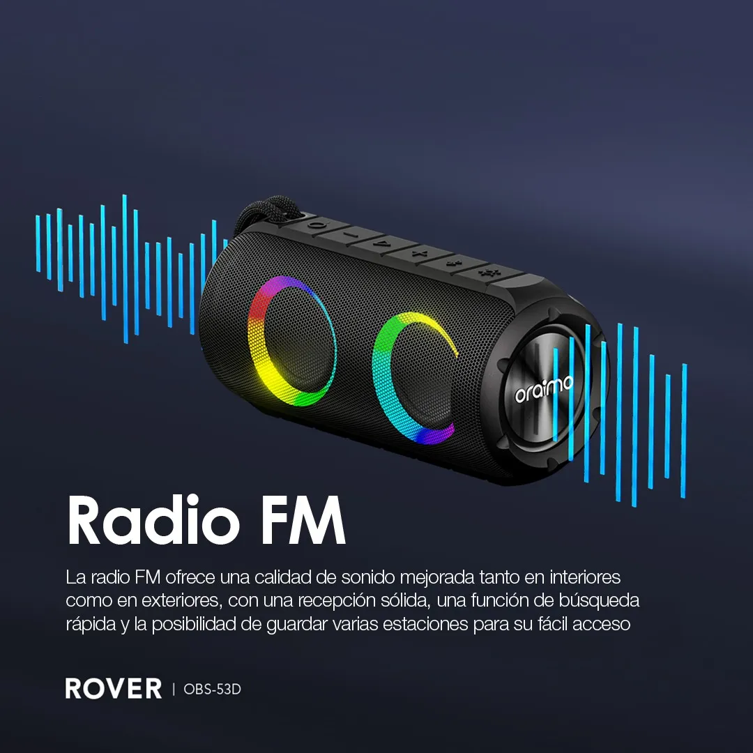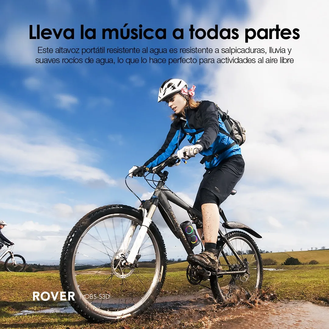 Este altavoz portátil con clasificación IPX5, es resistente a salpicaduras, lluvia y suaves rocíos de agua, lo que lo hace perfecto para actividades al aire libre. Diseñado con una estructura ajustable de 180 grados, Rover puede girar horizontal o verticalmente para proporcionar una dispersión del sonido más amplia.