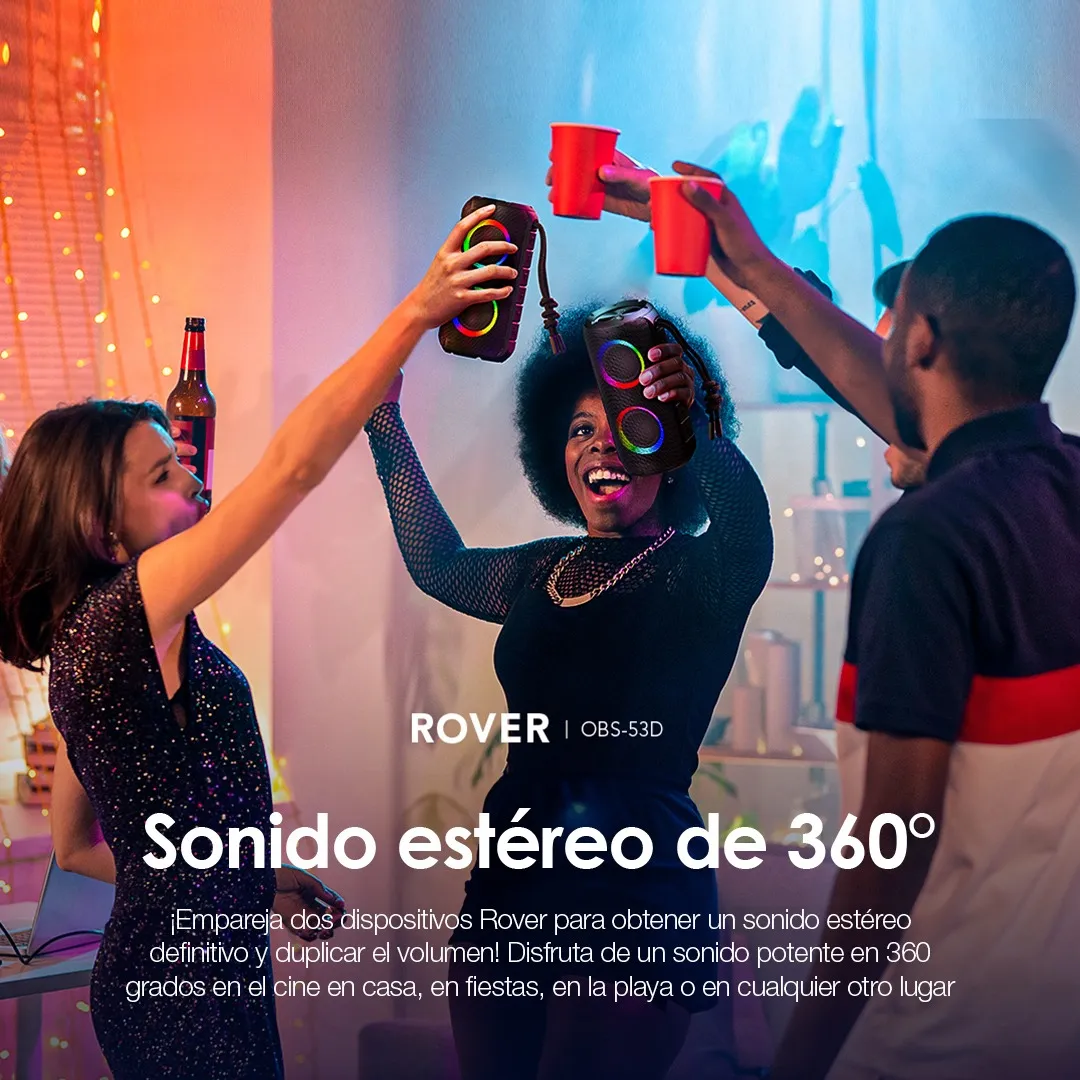 ¡Empareje dos dispositivos Rover para obtener el mejor sonido estéreo y duplicar el volumen! Disfrute de 360° de música a todo volumen en el cine en casa, en fiestas, en la playa, en el parque o en cualquier otro lugar imaginable. ¡Hagamos ruido!